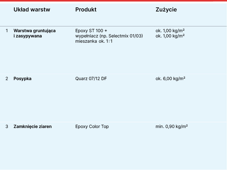 Powłoka epoksydowa, zasypywana piaskiem kwarcowym o strukturyzowanej powierzchni, do miejsc gdzie występują silne obciążenia mechaniczne.