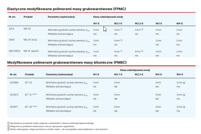 Hydroizolacja budynków odgrywa kluczową rolę w utrzymaniu wartości nieruchomości. W przypadku materiałów uszczelniających, które mają być aplikowane w postaci płynnej, jako kryterium jakości i trwałości należy uznać minimalną grubość suchej warstwy. W zależności od zastosowanego materiału uszczelniającego jest ona określana na podstawie klasy odporności na działanie wody zgodnie z normą DIN 18533 oraz dostępnych świadectw przydatności danego produktu. Ponieważ normalizacja od zawsze „nie nadąża” za postępem technicznym, niektóre nowoczesne rozwiązania uszczelniające wciąż nie zostały przez nią uwzględnione. Elastyczne, modyfikowane polimerami masy grubowarstwowe, choć pod wieloma względami przewyższają produkty ujęte w normach oraz od lat sprawdzają się w praktyce, nie zostały jeszcze uwzględnione w normie DIN 18533. Sposób ich zastosowania przy wykonywaniu hydroizolacji elementów budynku stykających się z gruntem opisano w opublikowanej 2020 roku instrukcji „Wytyczne dotyczące planowania i wykonywania hydroizolacji elastycznymi modyfikowanymi polimerami masami grubowarstwowymi (FPMC). Poniższa tabela zawiera przegląd wymagań dotyczących minimalnych grubości suchej warstwy oraz konieczności zastosowania wkładki wzmacniającej.