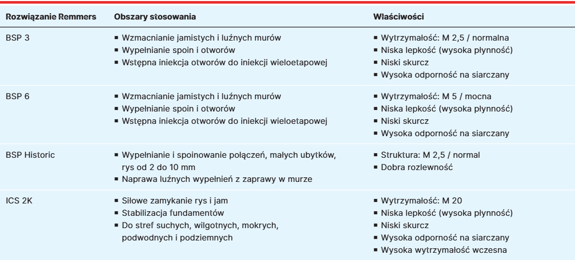 Zaprawy do wzmacniania luźnych konstrukcji i wypełniania rys i pustek w murach różnią się właściwościami fizycznymi i mechanicznymi. W zależności od ustaleń, możliwe jest, że wzmocnienie muru za pomocą opartej na cemencie zawiesiny BSP 3 i BSP 6 lub materiałów o niskiej wytrzymałości, takich jak BSP Historic. Do spoinowania murów poddawanych większym obciążeniom statycznym warto użyć Remmers Injektionsleim ICS 2K, ponieważ może on również w pewnym stopniu przejmować naprężenia rozciągające. Opis produktu